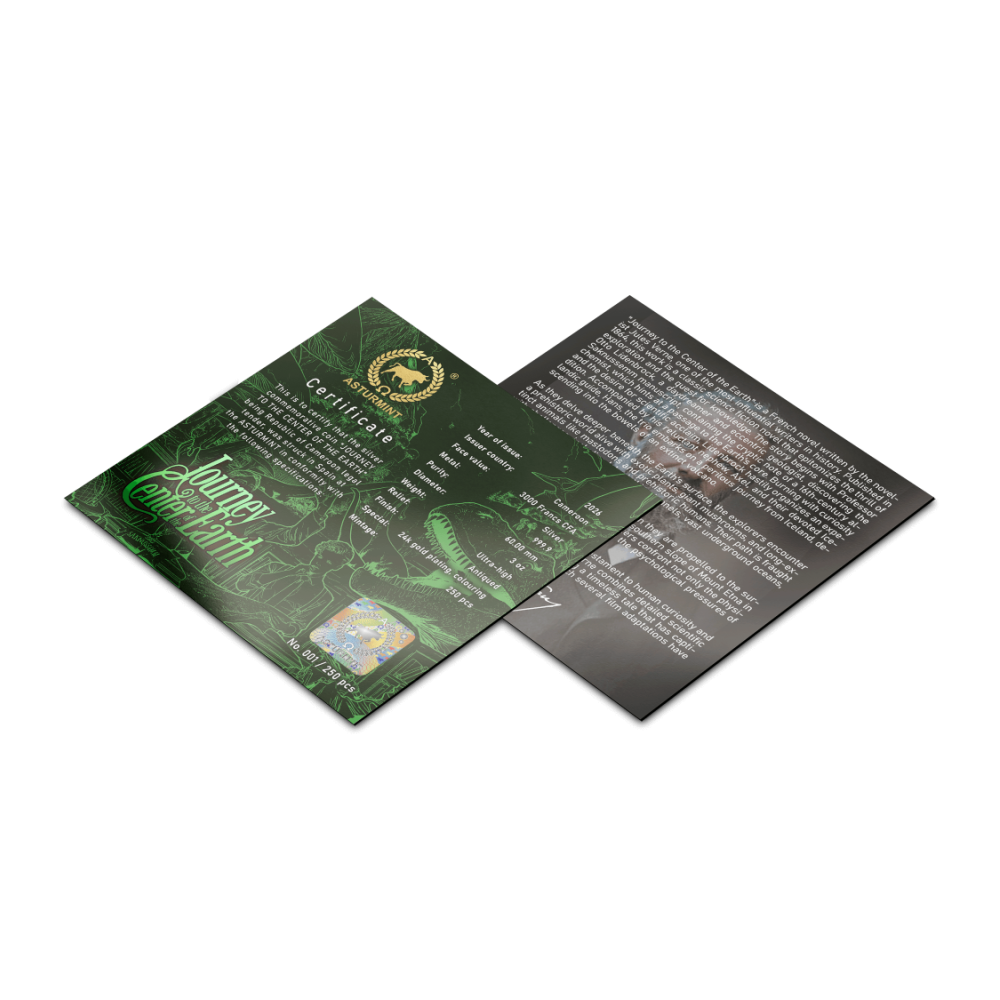 Tämä upea 3 unssin hopeakolikko syventyy Jules Vernen romaaniin "Matka maan keskipisteeseen". Professori Lidenbrockin kuumeinen kunnianhimo vetää Axelin läpi pelon ja ihmettelyn synkkien suonien. Muinainen pinta tuo mieleen muinaisten luolien pölyn. Ultrakorkea reliefi kohoaa kuin rosoiset kalliot. Valikoiva kultaus loistaa kuin löytökipinä. Kolikko on kotelossa, jossa on aitoustodistus. Maailmassa on vain 250 kappaletta.