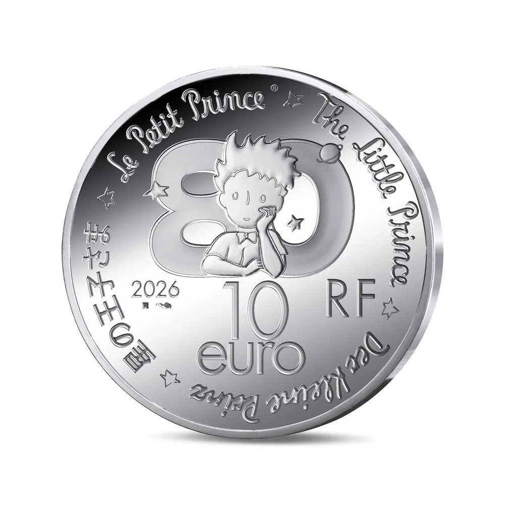 Kolikon kääntöpuolella, nimellisarvon yläpuolella, on Pikku Prinssin 80-vuotisjuhlavuoden logo, joka koostuu käsivarteensa nojaavan hahmon rintakuvasta numeron 80 edessä. Reunassa on ranskan-, englannin-, saksan- ja japaninkielinen kirjoitus "Pikku Prinssi", joka muistuttaa hahmon universaalista ulottuvuudesta. Kuvassa on myös RF-merkki, kaivertajan työpajan ja mestarikaivertajan merkit sekä vuosiluku 2026.
