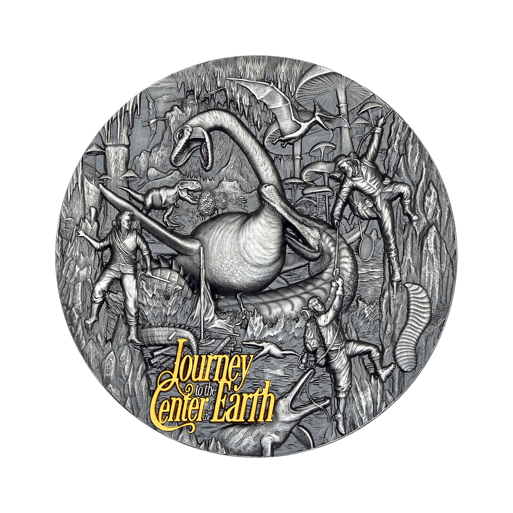 This gorgeous 3-ounce silver coin delves into Jules Verne's novel "Journey to the Center of the Earth". Professor Lidenbrock's feverish ambition pulls Axel through dark veins of fear and wonder. The ancient surface evokes the dust of ancient caves. Ultra-high relief rises like jagged rocks. Selective gilding shines like a spark of discovery. The coin is housed in a case with a certificate of authenticity. There are only 250 pieces in the world.